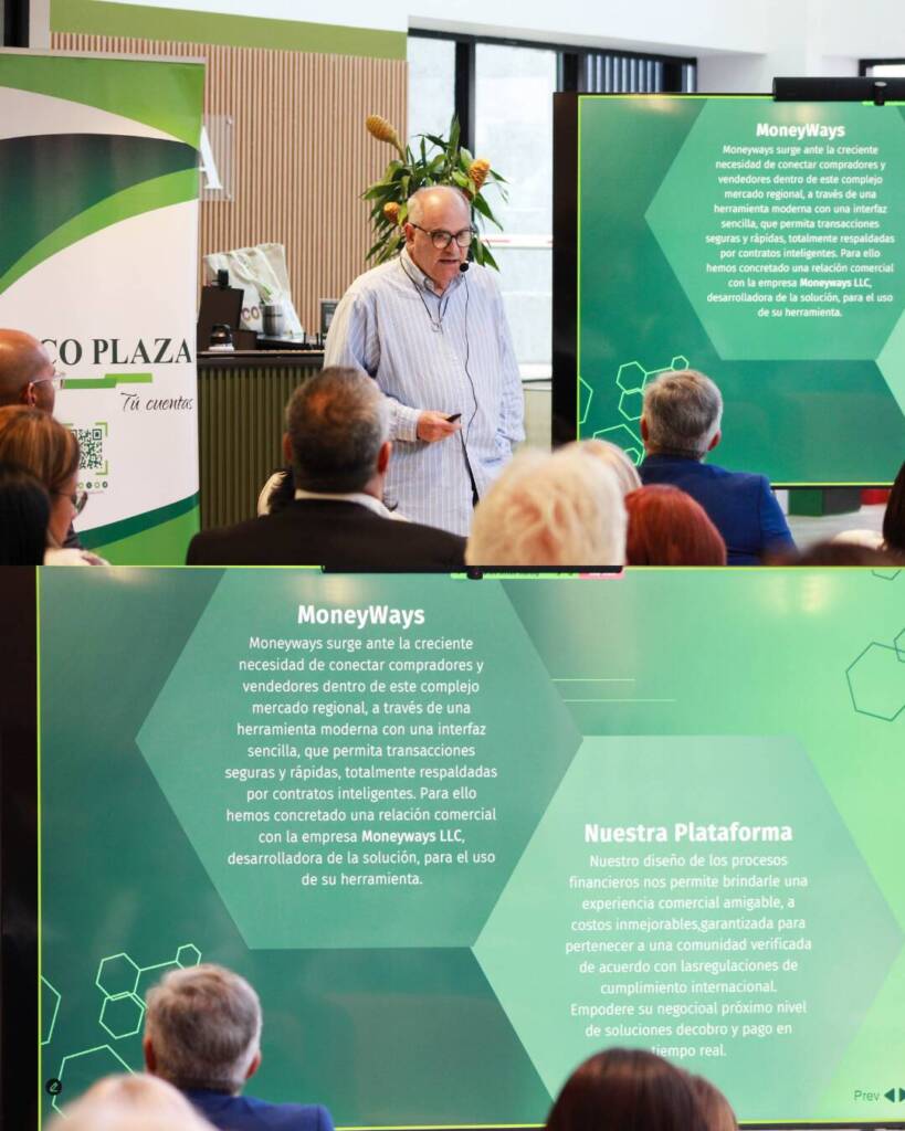 Posteriormente, representantes de MoneyWays —Jorge Van Eederwijk y Alejandro González— expusieron sobre su plataforma de pagos, una solución que conecta compradores y vendedores en el mercado regional mediante una interfaz sencilla, transacciones seguras y rápidas respaldadas por contratos inteligentes, diseñada para fortalecer la confianza y eficiencia en el comercio internacional. @moneywaysllc