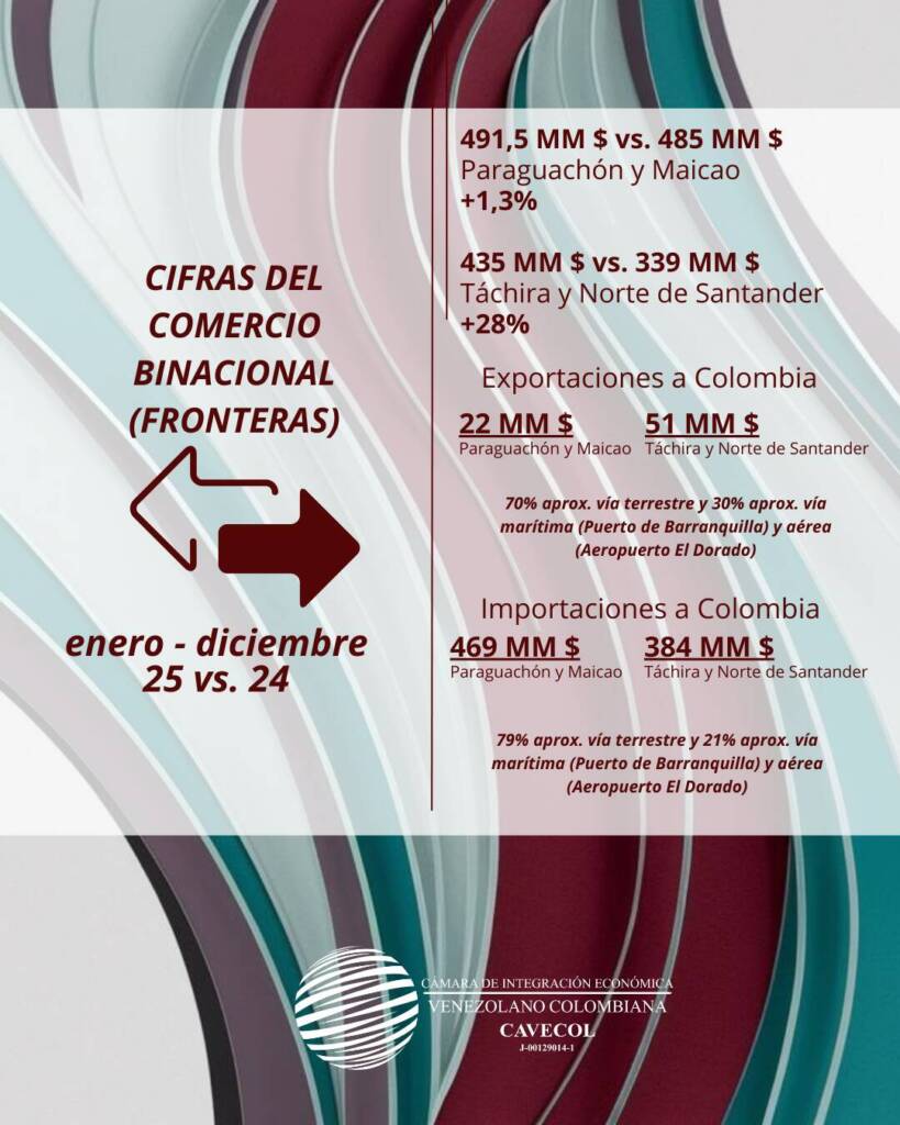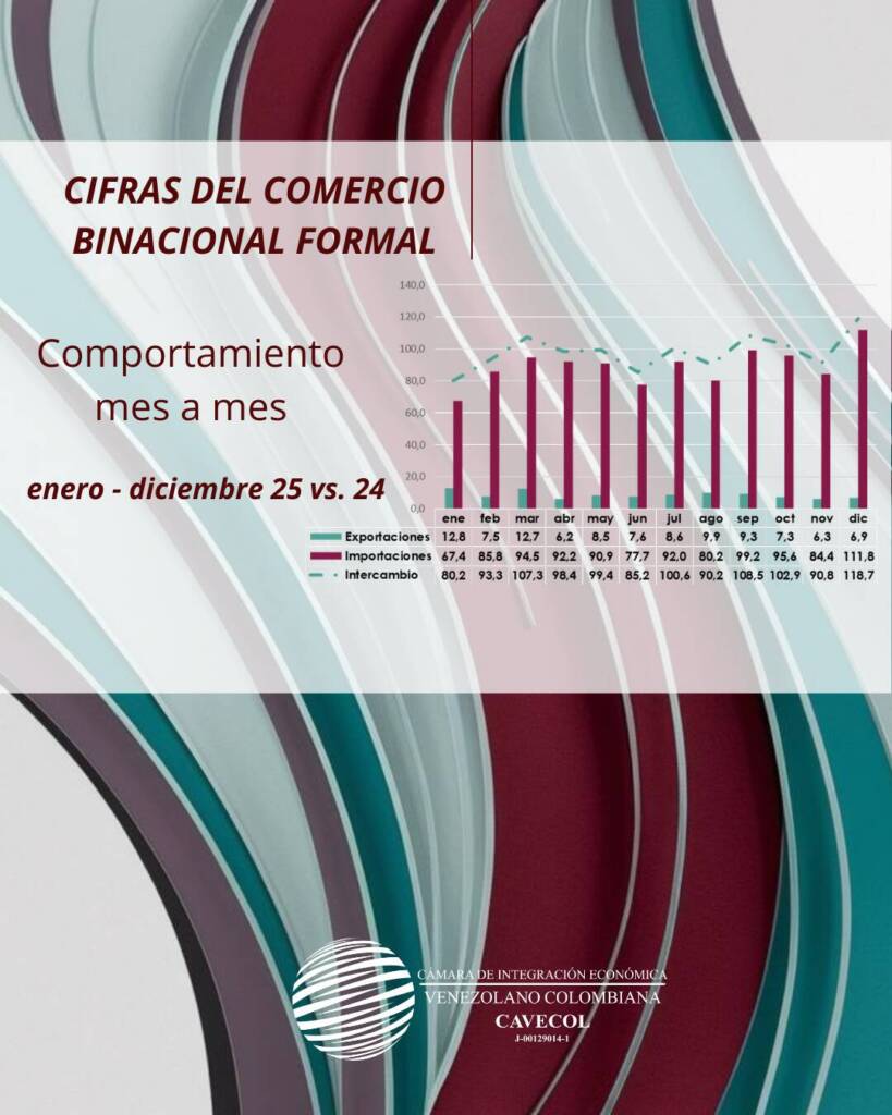El comercio binacional entre Venezuela y Colombia en el mes de diciembre de 2025 alcanzó un volumen de 1.175,5 millones de USD, lo que significa un aumento del 3,3% respecto a los 1.138 millones de USD registrados en el mismo período del año anterior. (Ver anexo No. 1 a continuación).