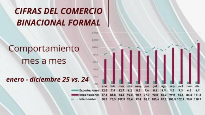 De la gráfica anterior puede observarse que el comportamiento general del comercio binacional durante el año 2025 mantuvo una conducta oscilante, primero de normalización y/o meseta, luego signos de leve incremento; más tarde de caída, para cerrar en un alza, que está amarrada al flujo de importaciones desde Colombia.