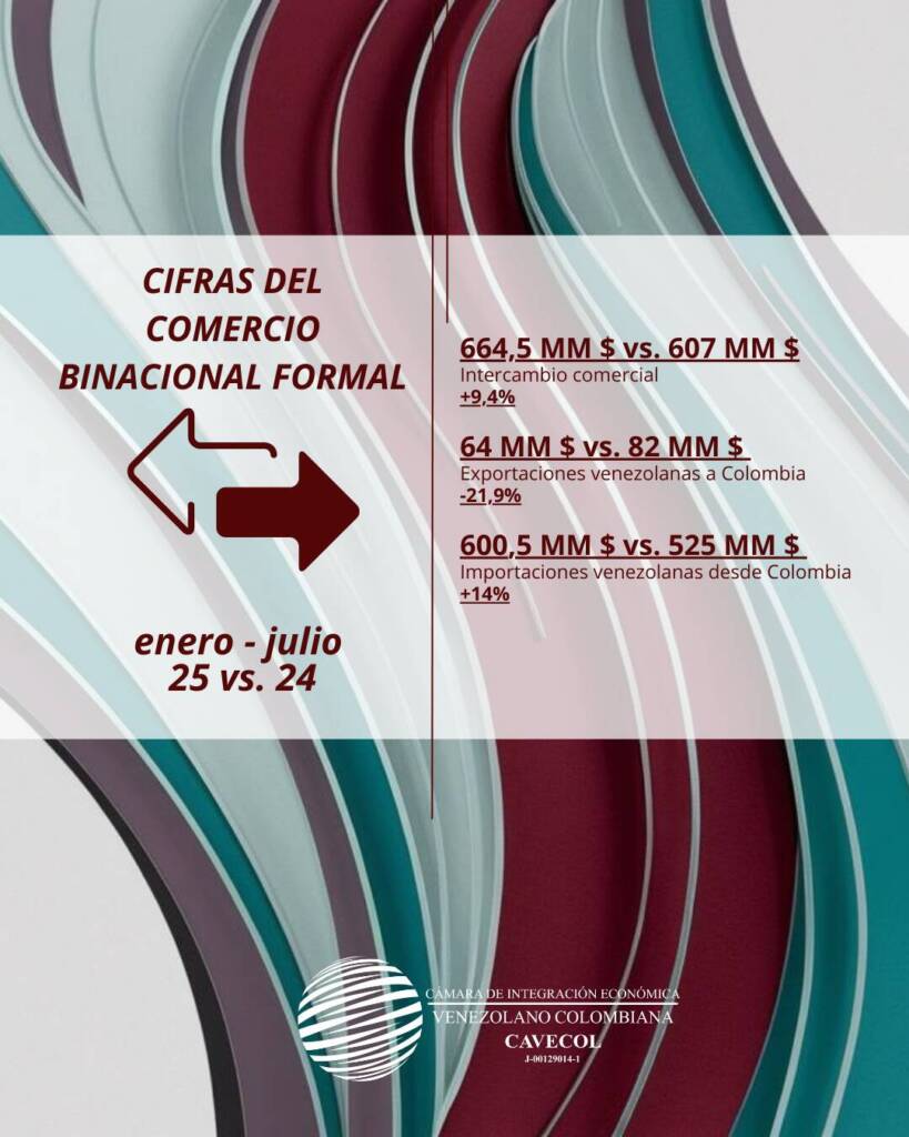 El comercio binacional entre Venezuela y Colombia en el mes de julio de 2025 alcanzó un volumen de 664,5 millones de USD, lo que significa un aumento del 9,4% respecto a los 607 millones de USD registrados en el mismo período del año anterior. (Ver anexo No. 1 a continuación).